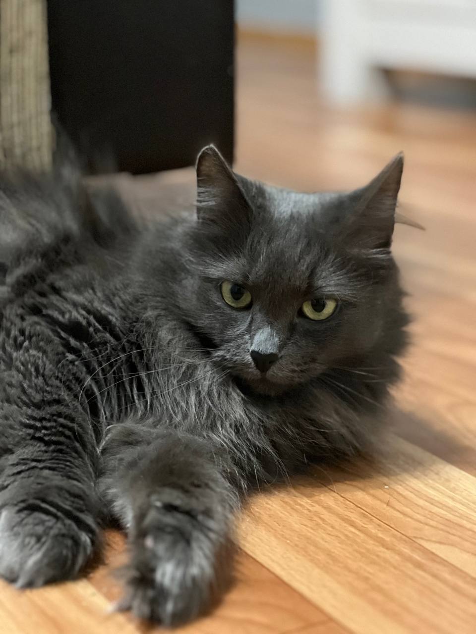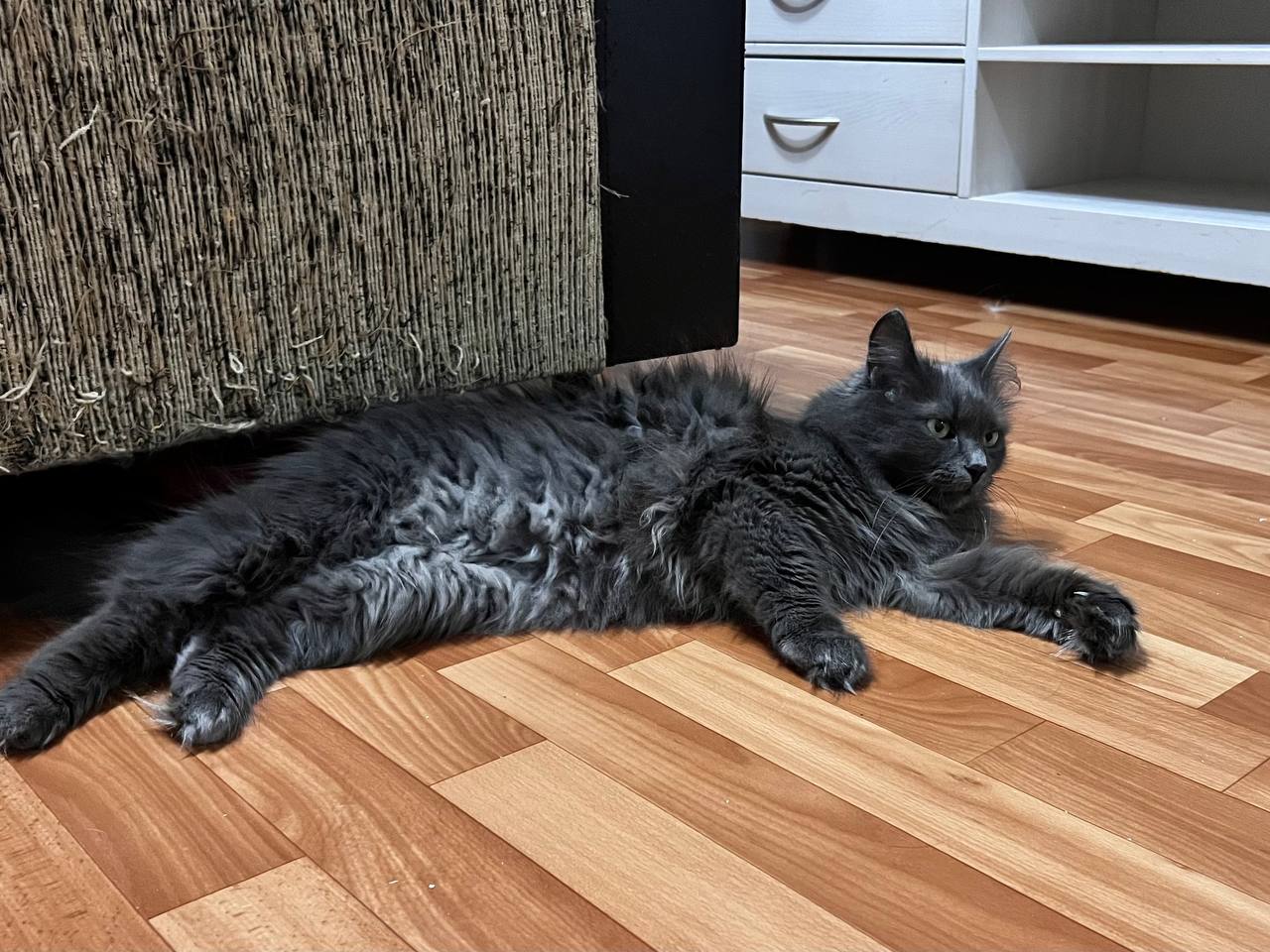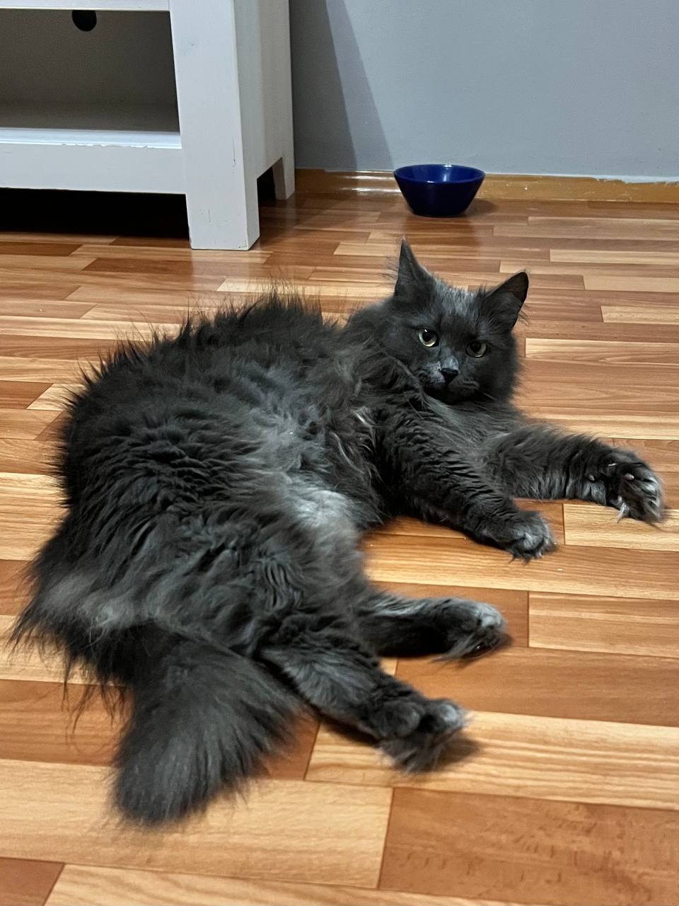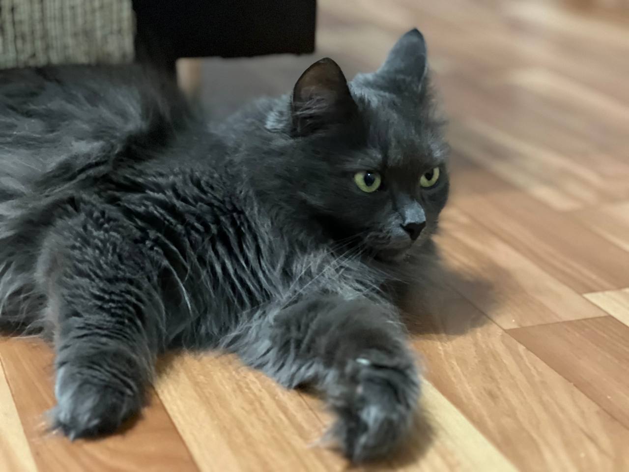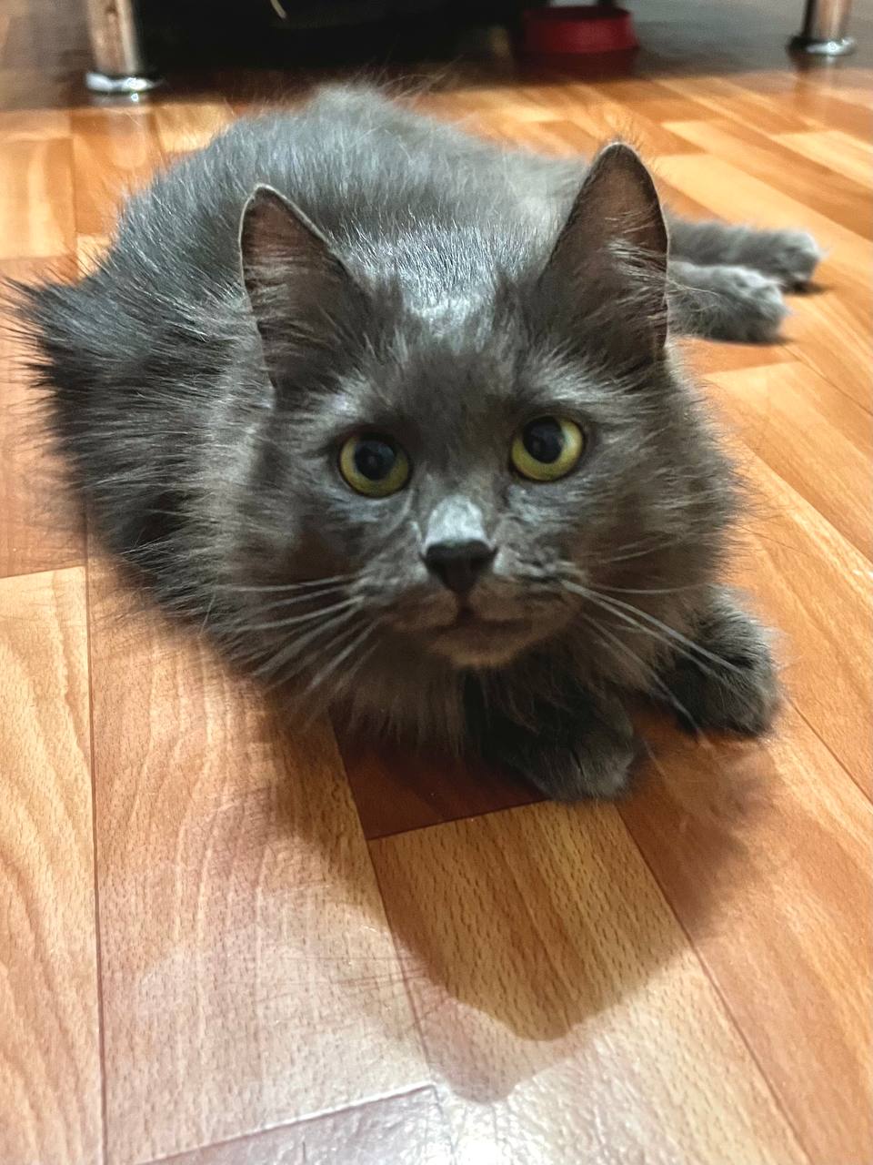 Очень красивая кошечка с густой пушистой шерстью, шикарным хвостом и выразительными глазами (фенотип породы нибелунг). Любит гладиться, мурчать, ждет, когда к ней подойдут, почешут. При этом знает себе цену – если ей что-то не нравится, даст это понять (иногда, может дать лапой, но без когтей).