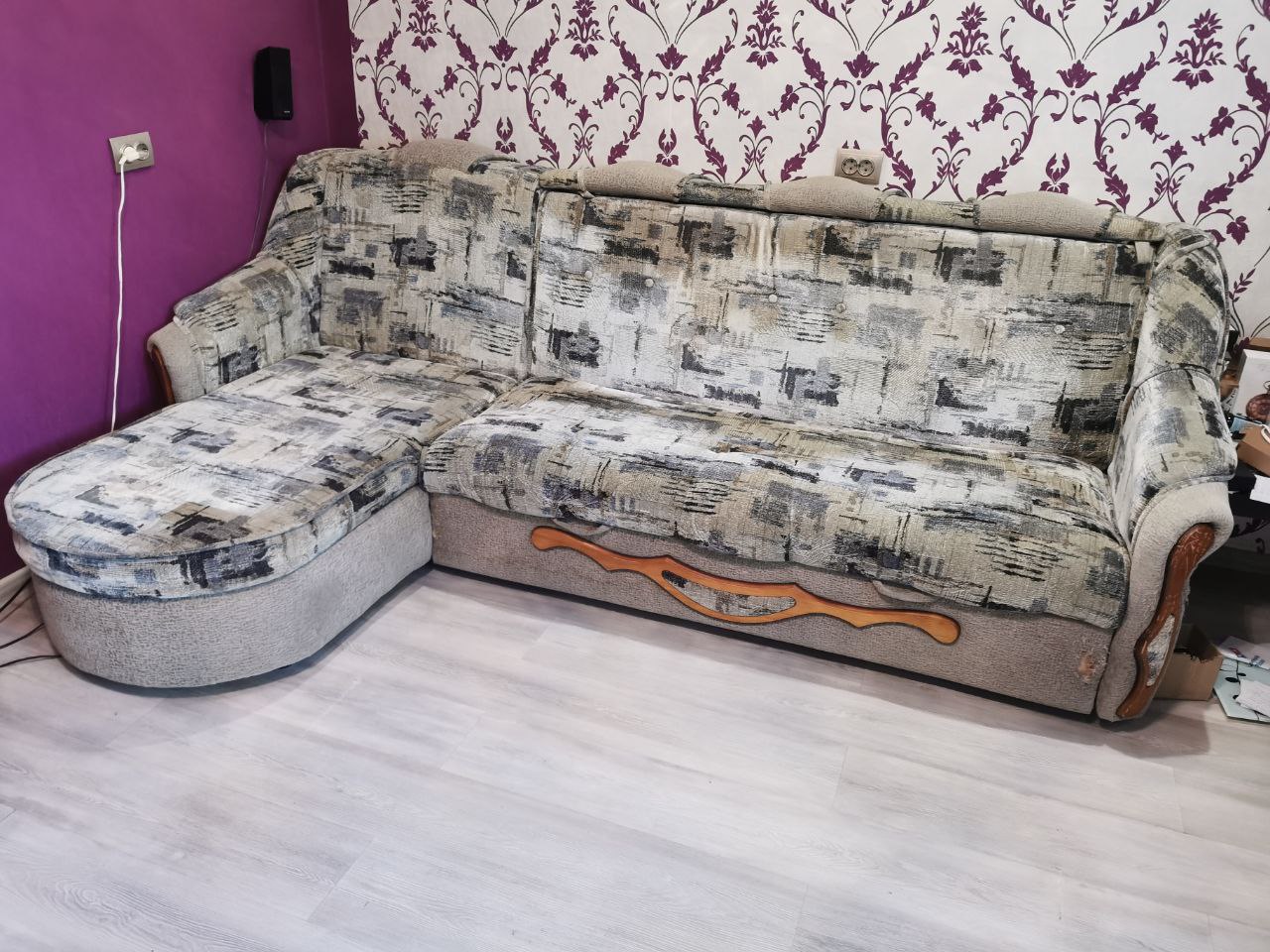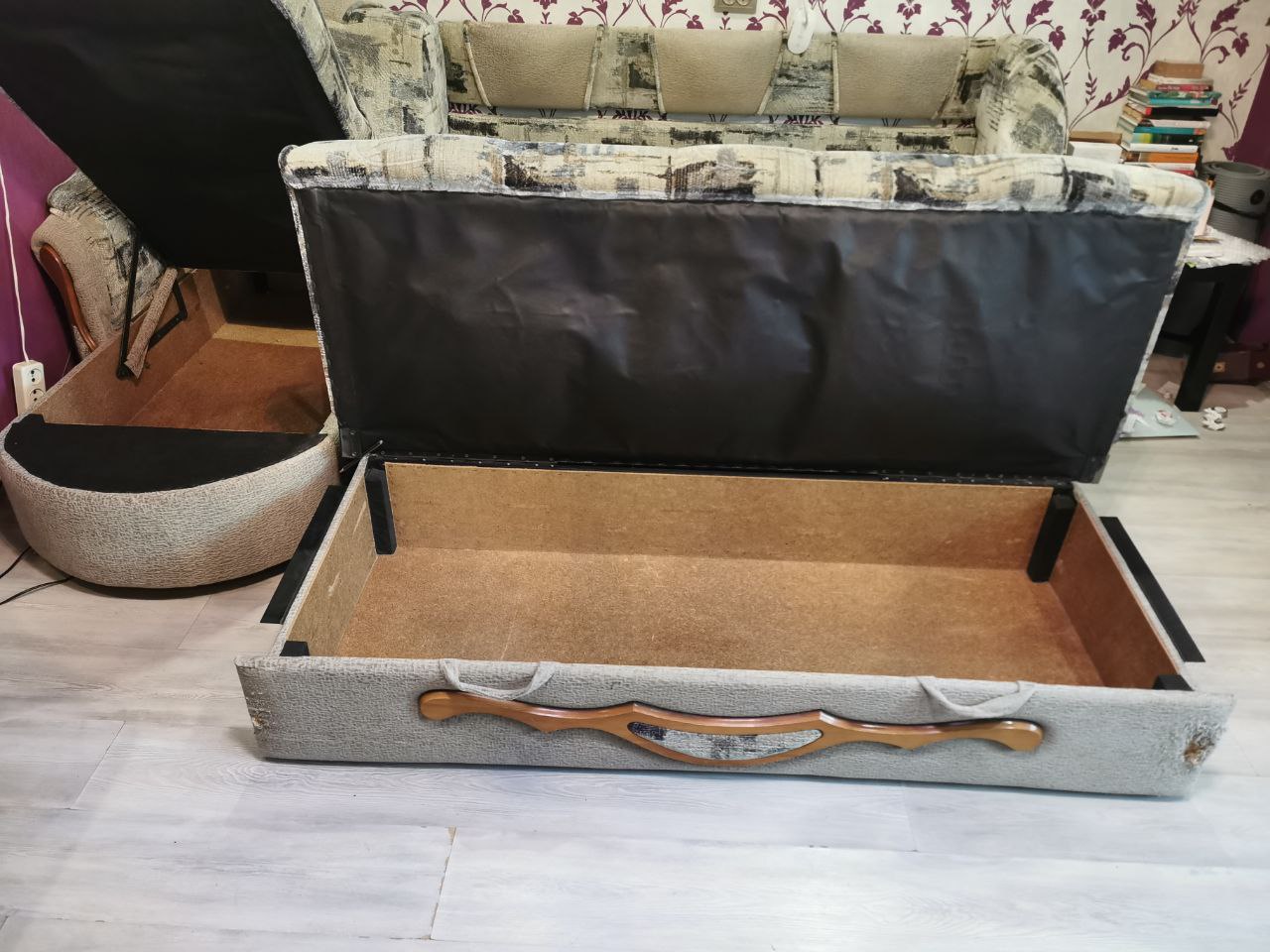 Б/У в хорошем рабочем состоянии. Каркас из дерева, есть небольшие дефекты. Большие ниши для хранения. Большое спальное место.