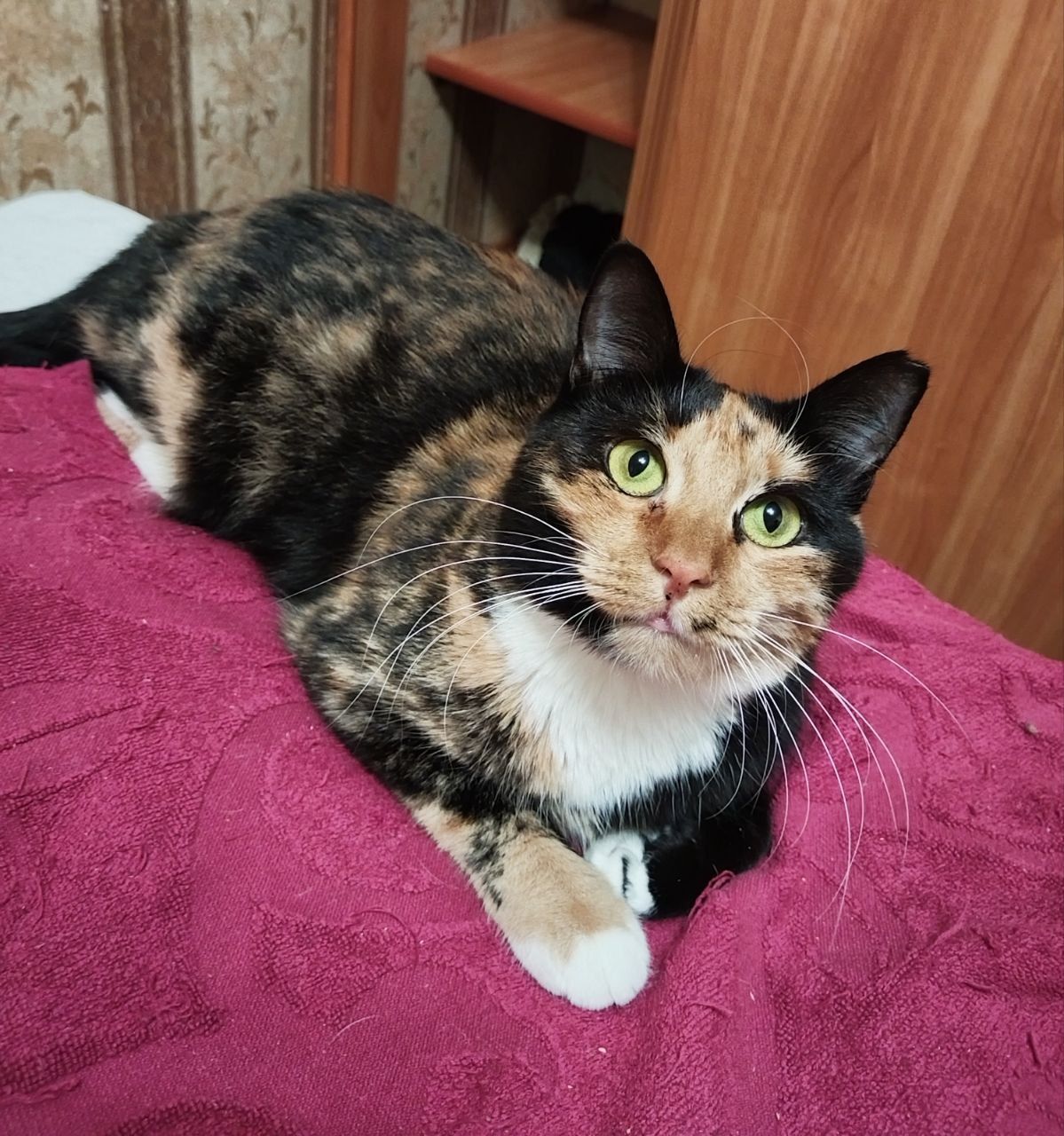 Кошечке два года, была спасена с улицы. Лапушка стерилизована, здорова, приучена к лотку и когтеточке, очень аккуратная. Девочка невероятная красавица трехцветного черепахового окраса, очень ласковая и нежная. Спокойная, наблюдательная, отлично поладит с другими котами, совершенно не конфликтная.